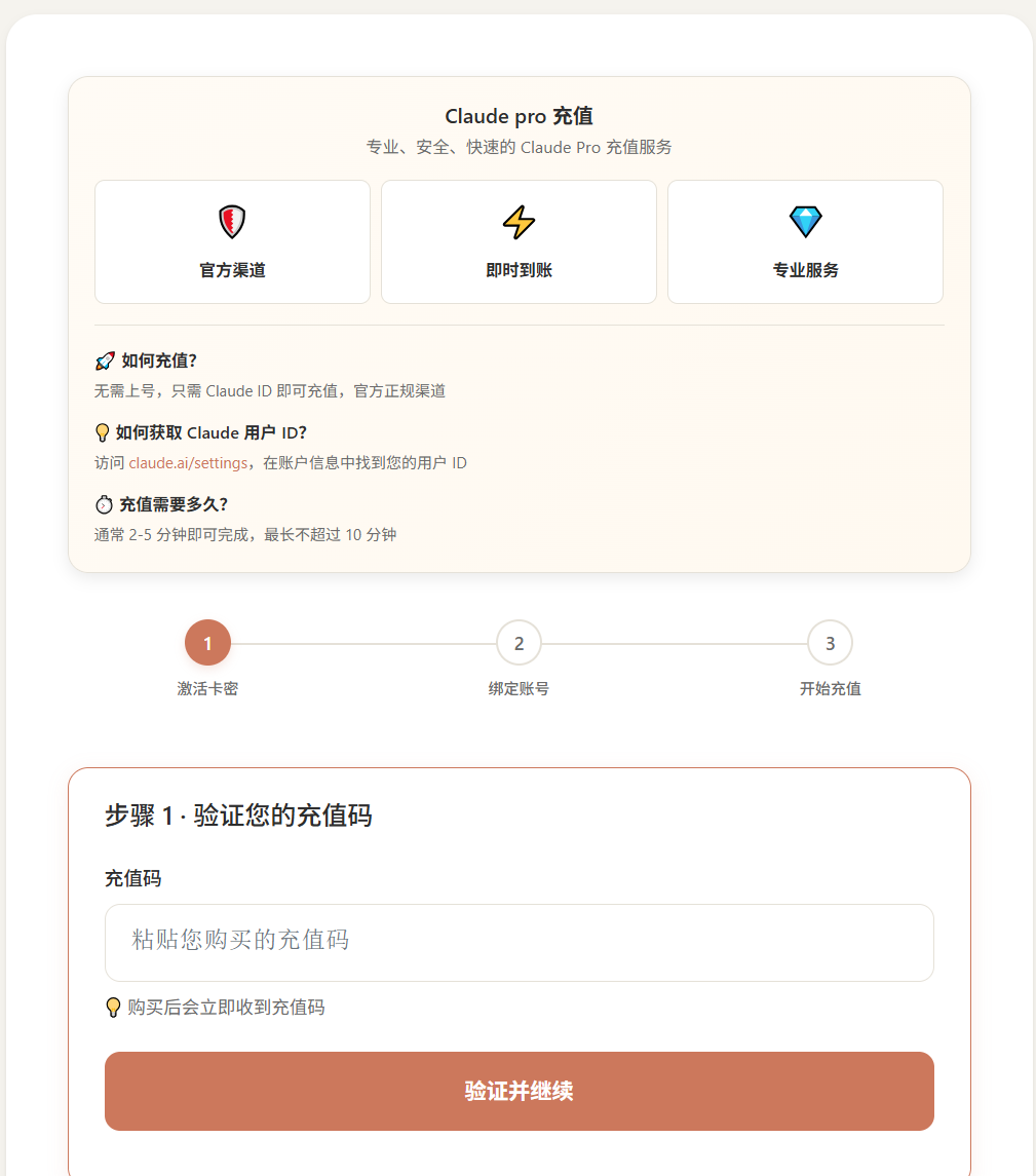 购买获取到卡密后,请到:Cluade Pro自动充值系统进行充值!本商品无售后,由于claude创始人敌对中国,封号,无法管控。请谅解!